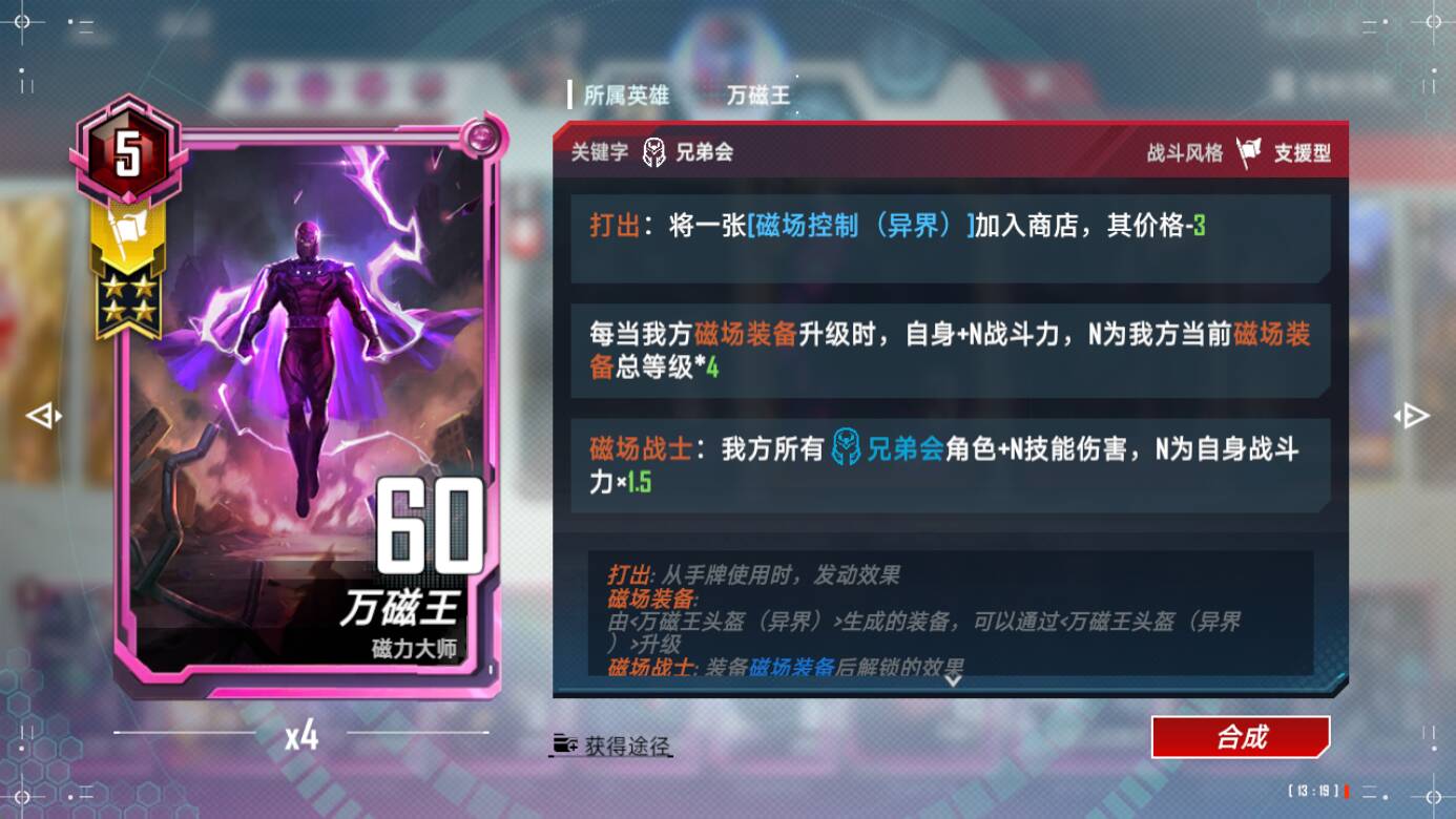 本事件卡不通过4费这个单位获取,都是靠着磁场控制去变商店中的单位,需要注意的是,每个磁场战士武器装备等级最高4级,在升级装备的时候需要数一下装备层级。优先升级万磁王>火人>银武>戴肯>蛤蟆
