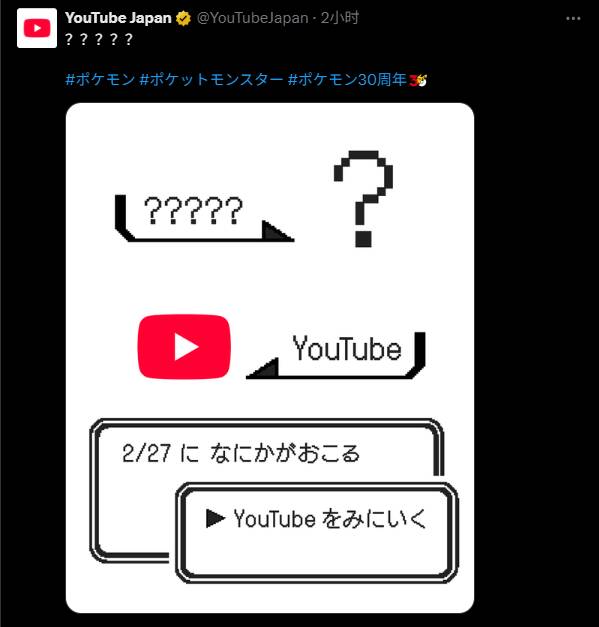 如今互联网无数知名IP,能够惊动到油管官方亲自造势的真的不多,今天油管日本官方X罕见发布神秘预告,称2月27日似乎要发生什么?根据推荐标签推测以及那玩家熟悉的“界面”,或为宝可梦直播造势。