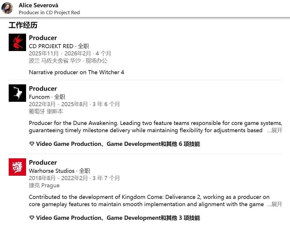 CD Projekt RED正在全力推进《巫师4》的开发工作,为此持续扩充其核心团队。最新加入的资深开发者是曾担任《天国:拯救2》和《沙丘:觉醒》制作人的爱丽丝·塞维罗娃(Alice Severová)。
