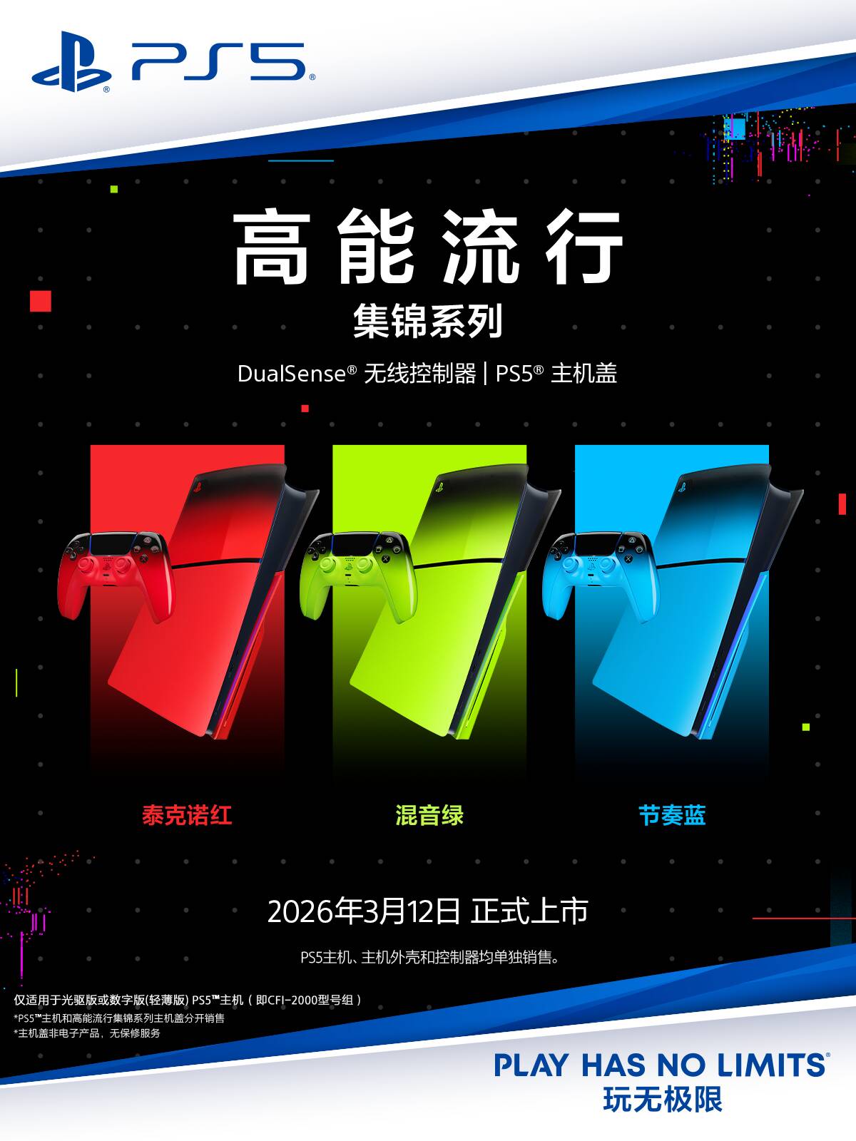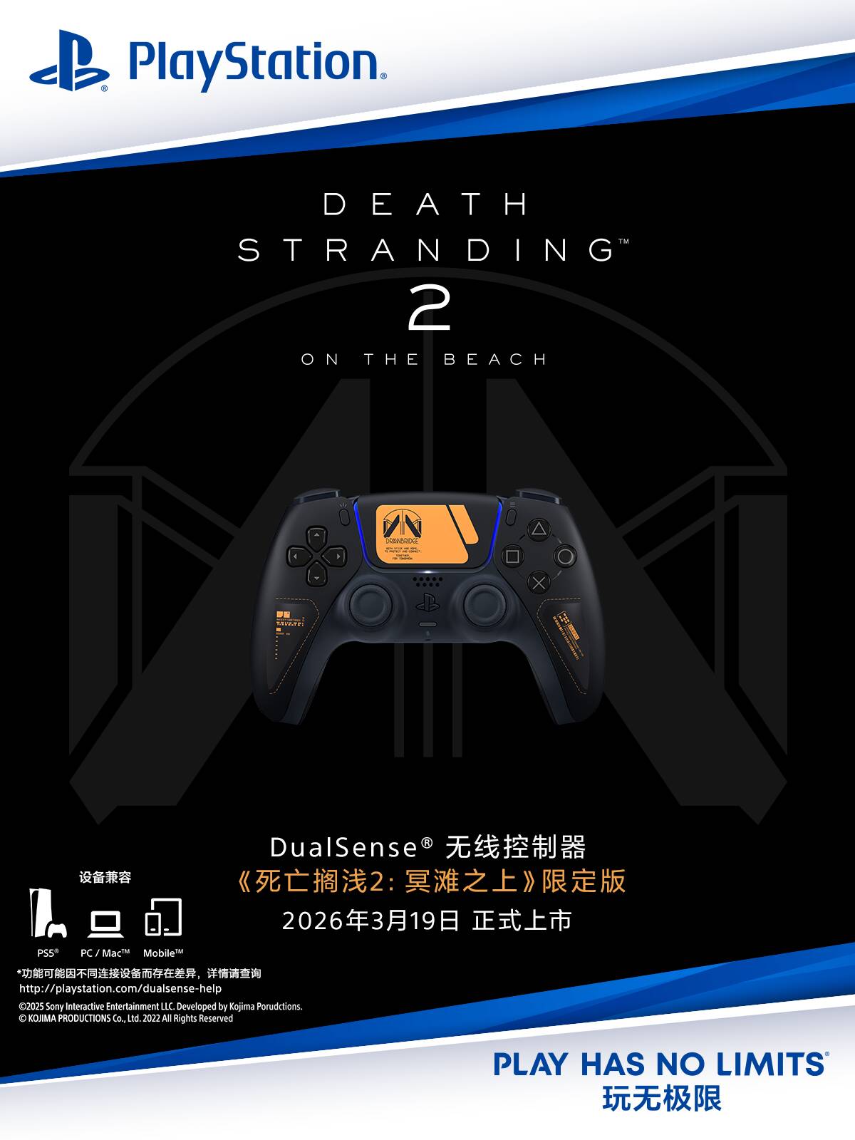 2026年2月27日—索尼互动娱乐(上海)有限公司(以下简称“索尼互动娱乐”)今日正式宣布,PlayStation多款全新配件将于2026年3月陆续在中国大陆上市,更好的满足玩家多样化游玩需求。配件产品包含:DualSense®无线控制器 -《失落星船:马拉松》限定版,3月6日正式上市,建议零售价人民币639元,即日开启预售;高能流行集锦系列DualSense®无线控制器及 PS5™(轻薄版)主机盖将于3月12日上市,建议零售价分别为人民币639元及人民币559元;DualSense®无线控制器 -《死亡搁浅2:冥滩之上》限定版,将于3月12日开启预售,3月19日正式上市,建议零售价人民币639元。