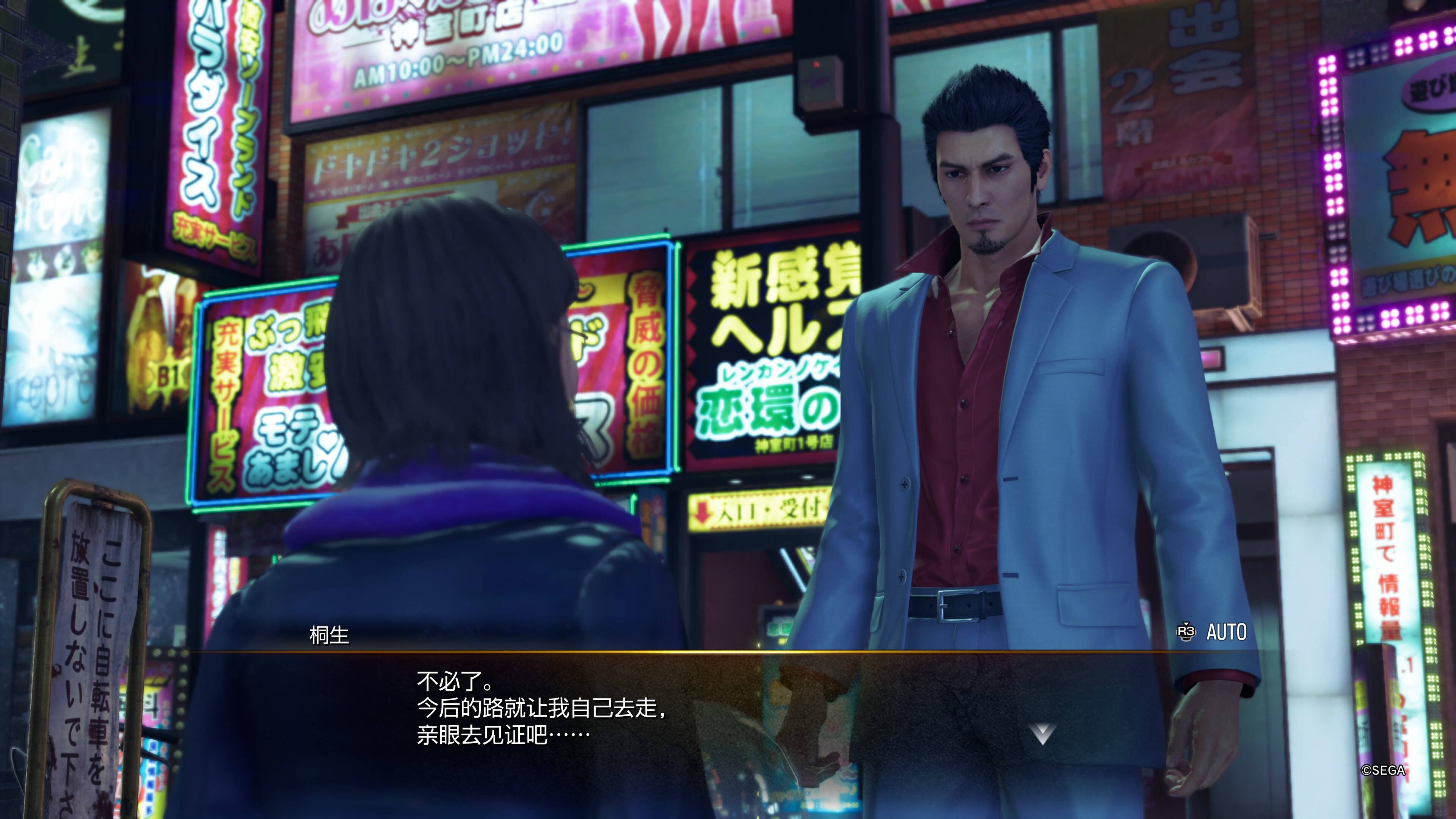 在质疑达到顶点,认为“只不过是漂亮话”之后不久,那束光最终还是照到了他的身上,在“神田大哥”为了钱抛弃他时,被他认为只会说漂亮话的会长拿着钱单刀赴会解救他,那句“只有堂岛大吾把我当作人”正是那时他的心情。虽然历经曲折,但他还是愿意牺牲自己去救堂岛大吾,希望他能回到那家酒吧。