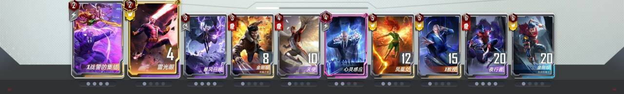 我们这个x战警终幕卡组肯定是先卡二找齐x战警终幕再上本的所以正常情况下前几回合都在二本呆着的顺的话可以早点上一般期望都在5回合的时候找齐终幕尽量再把小辣椒的假面夫人升满星再上假面最次也是2+1才行上5本之前一定得找到雷光眼不然到时候雷光眼被力量宝石删了就不好笑了,所以一般上本的时候都是一个雷光眼一个满星的假面夫人一个满星的小黄人和一个满星的小辣椒跟一个x战警集结升级的六费牌然后上本,就直接上到5本开始找凤凰女和角斗士来成型自己的卡组。找到凤凰女和角斗士力度就已经很大够吃分了要是对手不厉害吃鸡问题也不大的。