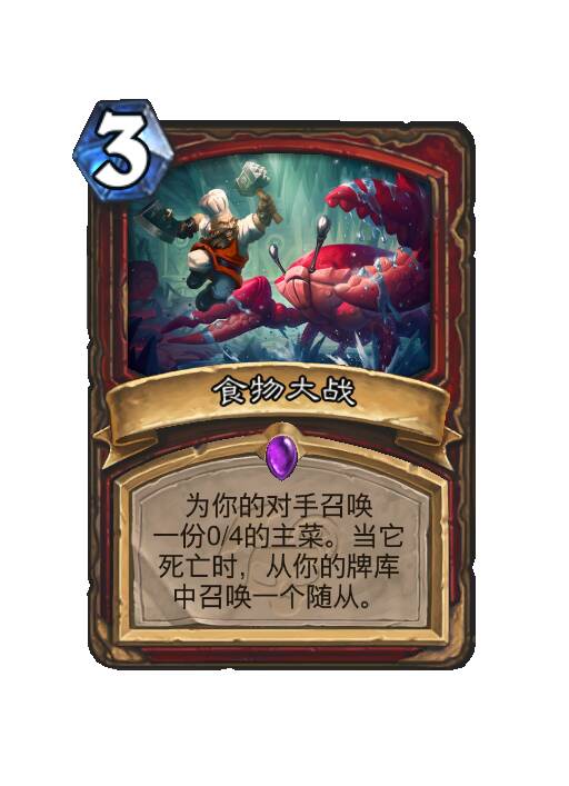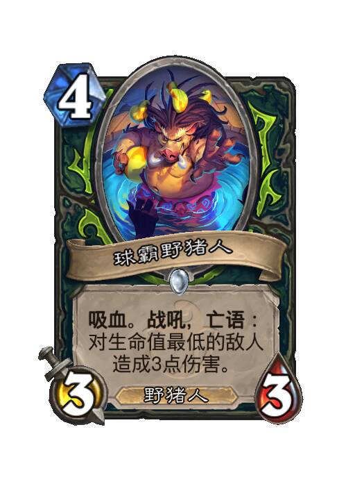 - 新:吸血。战吼,亡语:对生命值最低的敌人造成3点伤害。