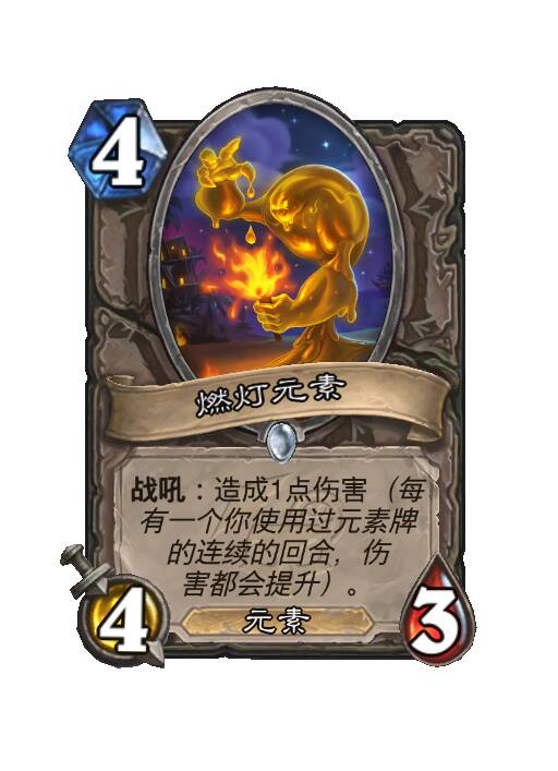 - 新:[4费4/3] 战吼:造成1点伤害(每有一个你使用过元素牌的连续的回合,伤害都会提升)。