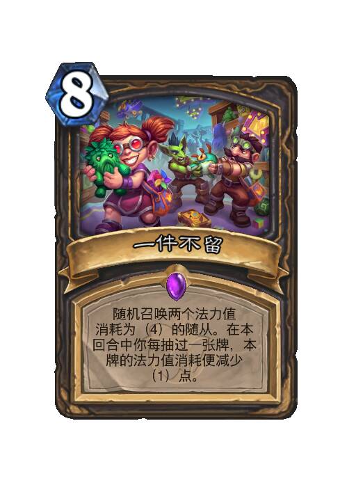 - 新:[9费] 你的战吼随从牌的法力值消耗为(1)点,但会在被使用后立即死亡。