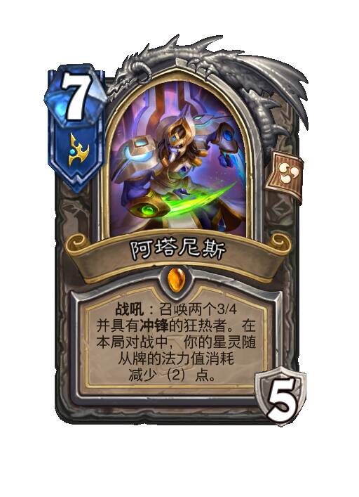 - 旧:[7费] 每回合中,你的第一张战吼随从牌的法力值消耗为(1)点,但会在被使用后立即死亡。