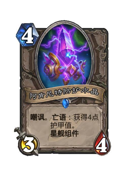- 新:[4费3/4] 嘲讽。亡语: 获得4点护甲值。 星舰组件。