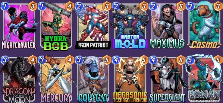 “水银炮”的强势回归为【超巨星】体系提供了“新”思路(其实是前人玩剩下的)——利用【跳跃者巴托克】【二代美队】等前期战力保证节奏,为【科斯默】【青少女弹头】等提供先手控制条件,最后依靠“水银炮”收尾。优势是前期节奏更加突出,在与传统构筑对阵是更容易争得先手,而后期则会因缺少大战力支撑而在爆发能力上略逊一筹,总体上仍然符合【超巨星】的核心展开逻辑,适合玩腻了【指控者罗南】【黑鹰】的玩家尝试。
