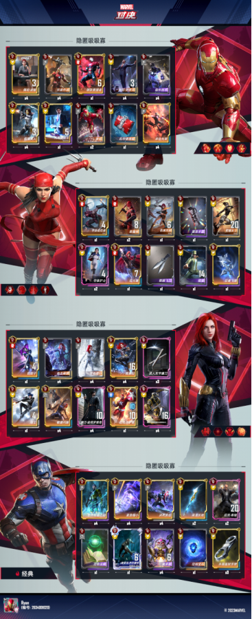 前期卡3找法典配合新卡界护士锁血【一般5,6回合打缩升5本时要看对手要不要卖护士再打出避免空缩小】找血魔组件【夫人 ,小辣椒,小黄人(可配合蛇托尼变钢铁侠单位再配合小辣椒链接赚钱)】,上5本后开扭优先托尼配合链接卖钢铁侠单位赚钱,找低费黄寡,界伊万筹齐寡妇双链接(必要时拿空间宝石给隐匿特工锁血),然后上6本(最迟8回合)优先找界狼人【打出检索黄寡,伊万,界镰刀(没有黄寡先不拿镰刀)】看到低费的麻痹,手铐,长枪,局长都可以拿