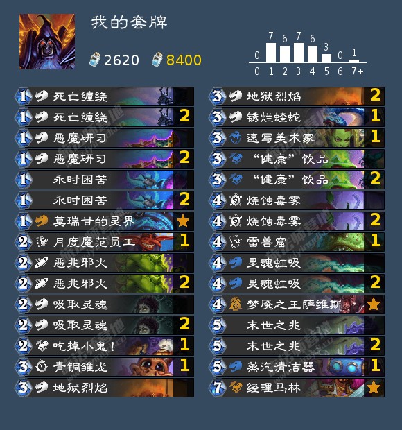 刚入坑一个星期,没氪金基本就是各种基础卡牌都没凑齐的状态。于是根据现有卡牌组了一套有意思的超低尘卡牌:同归于尽爆牌术!核心思路:先快速打空自己的牌库然后爆掉对面的牌库,再配合马林靠疲劳打死对面。牌型如下,可以根据需要和环境自行替换。