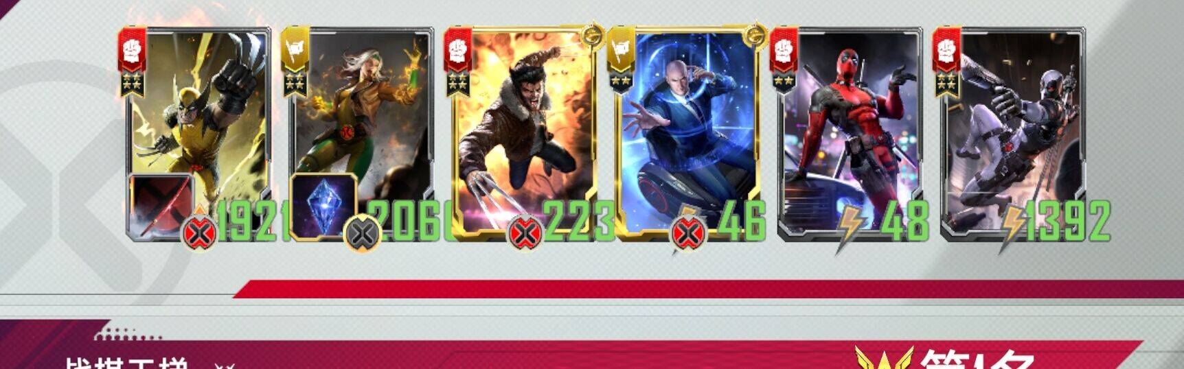 首先金刚狼和死侍这两个英雄是必须带的,最后一个选择艾丽卡,是为了通过至于法典和界守夜护士的组合在前期战斗中能膨胀大量战力,3狼效果也很适配法典。阵容角色分别是3费金刚狼、小淘气、5费金刚狼、X教授、红死、白死。除了X教授和红死侍以外其他尽可能4星。