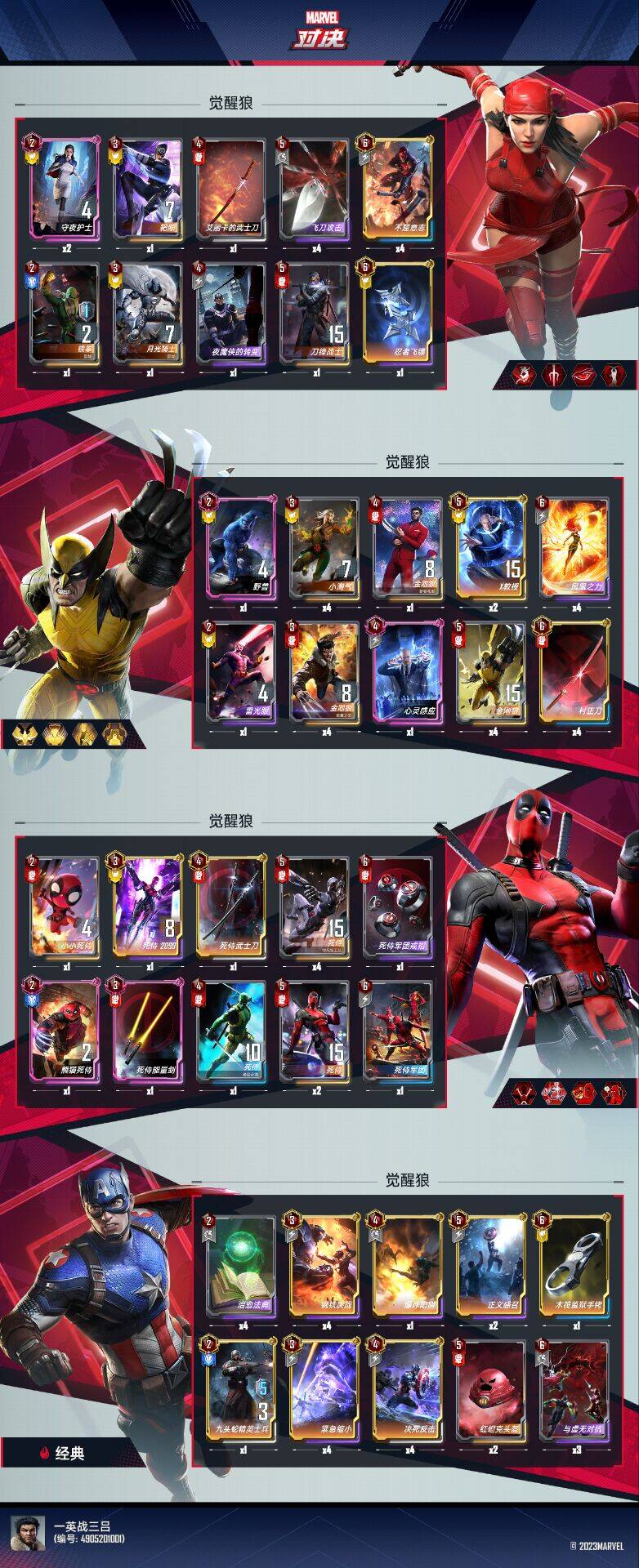 另外针对卡我选择的是与虚无对抗(我只有3张,齐了就带满),用来抓维山帝3链。同时我带了手铐,可以给小淘气装上抢1号位。进攻型角色的装备没什么特别需求,头盔和村正刀根据对局来决定,先制摧毁多就头盔,不多或者拼数值的话就村正刀。每回合结束时尽量保持3狼是觉醒的,一般5狼能吃到600左右是很不错了,不用太追求5狼的身材,不过要注意能升星就升星,升星打出加的战力多一些,这个还是能贪就贪。后期遭遇区根据战况可以卖法典上与虚无的对抗。一般7回合左右阵营就能初步成型,主要发力点还是在3狼小淘气链接上,这版本X终幕很多,小淘气很吃香,并且小淘气能一定程度上能去对线揭示卡组。另外着重推荐靶眼这张卡(3费的),我死侍3费带的武器只有死侍能量剑,3本打出靶眼要么拿到小淘气用的加特林机枪,要么滤掉死侍能量剑,非常好用。