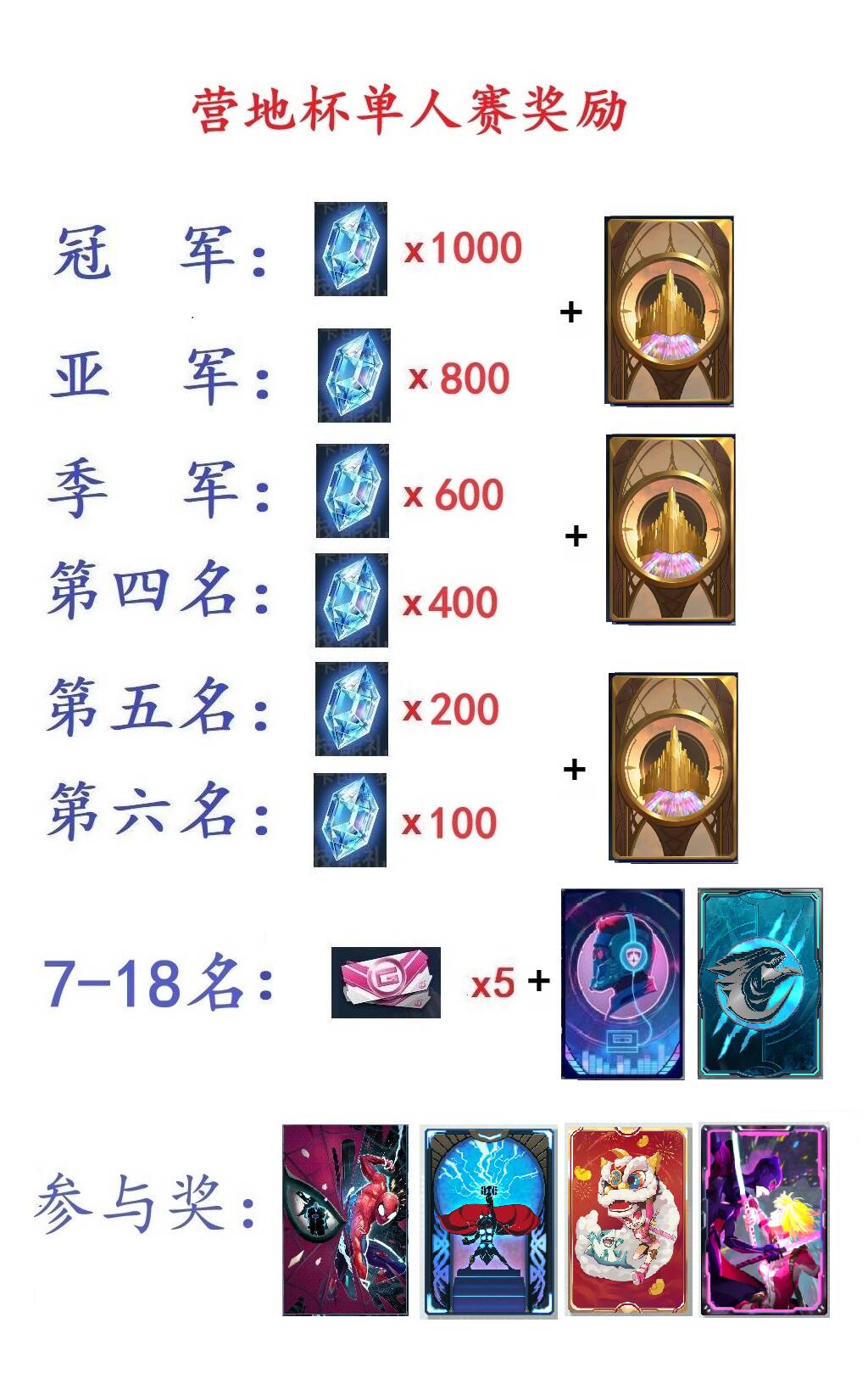进入半决赛(前18名)的玩家都有奖励(以进入名单为准),具体奖励如下: