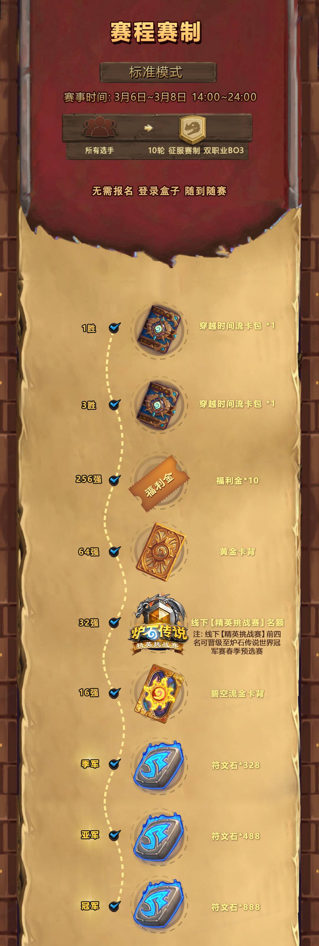 和去年几乎一样,挑战者赛道是国服炉石电竞选拔体系三条赛道中对广大普通玩家最友好、门槛最低的赛道,每赛季两场基于官方插件的线上挑战赛,各取32人晋级该赛季线下的精英挑战赛,后者的前四名再晋级当季季赛。只是从季赛起直接晋级年终总决赛,某种程度上相当于所有基层赛事都提升了一个级别。
