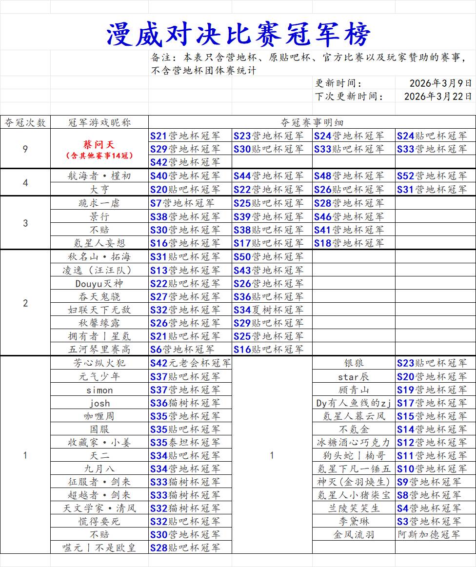 漫威对决赛事冠军榜(2026年3月9日更新)