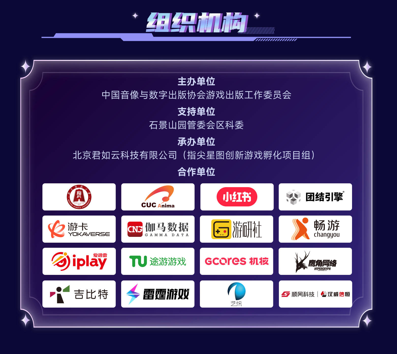 大赛由中国音像与数字出版协会游戏出版工作委员会主办,石景山园管委会区科委支持,北京君如云科技有限公司(指尖星图创新游戏孵化项目组)承办,北京师范大学艺术与传媒学院、中国传媒大学动画与数字艺术学院、小红书、杭州游卡网络技术有限公司、北京伽马新媒文化传播有限公司、北京竞游心声传媒文化有限公司、北京畅游时代数码技术有限公司、北京爱谱雷科技有限公司、在线途游(北京)科技有限公司、上海汉威信恒展览有限公司、Unity中国、上海鹰角网络科技有限公司、厦门吉比特网络技术股份有限公司、深圳雷霆信息技术有限公司、艺忛(厦门)网络科技有限公司、机核网等合作参与。