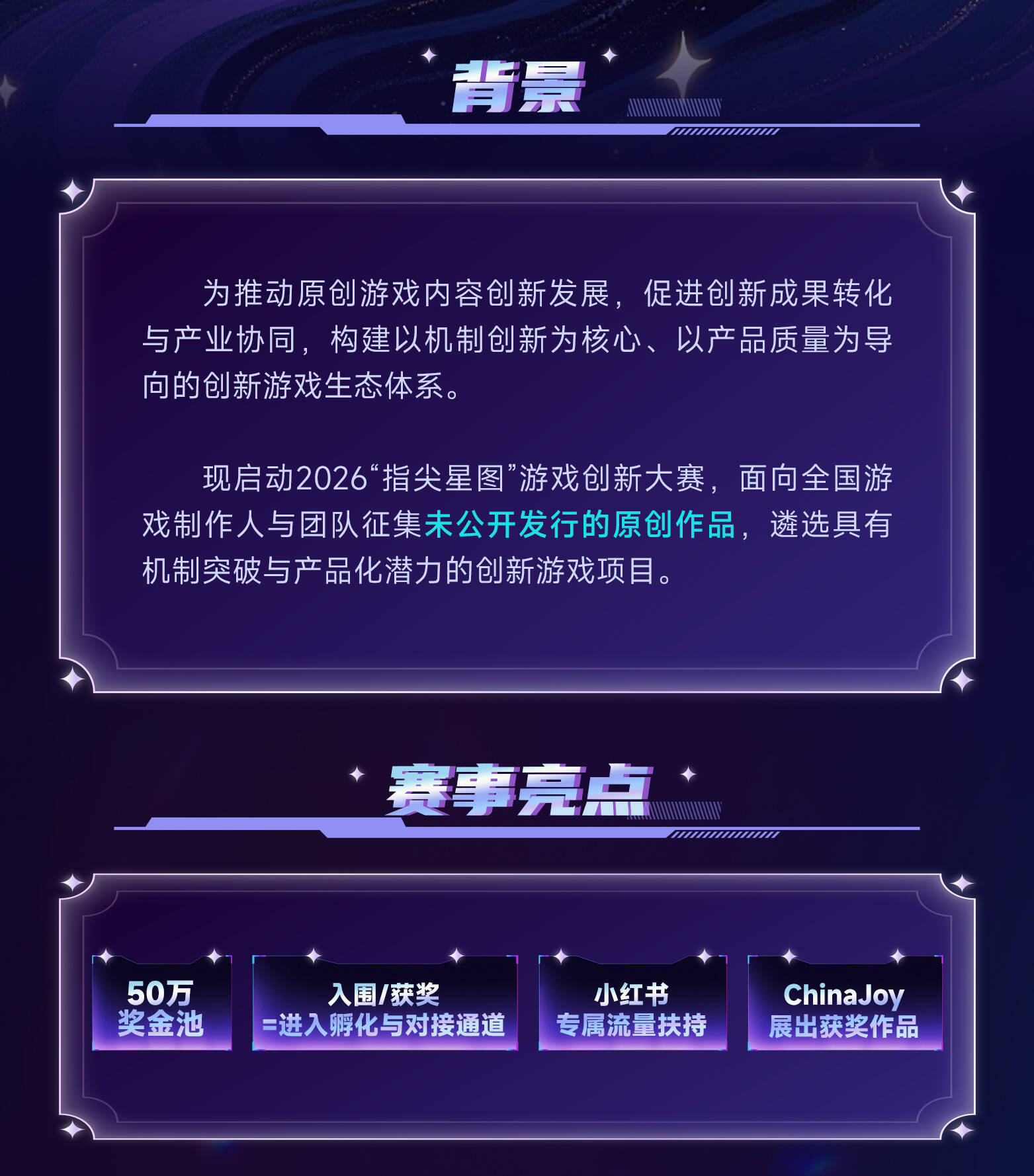 本届大赛与小红书游戏平台开展内容合作,开设参赛作品站内专属流量曝光扶持通道。参赛团队在提交作品的同时,需同步在小红书发布参赛作品宣传内容,并带话题#指尖星图游戏创新大赛+#我在小红书做游戏。