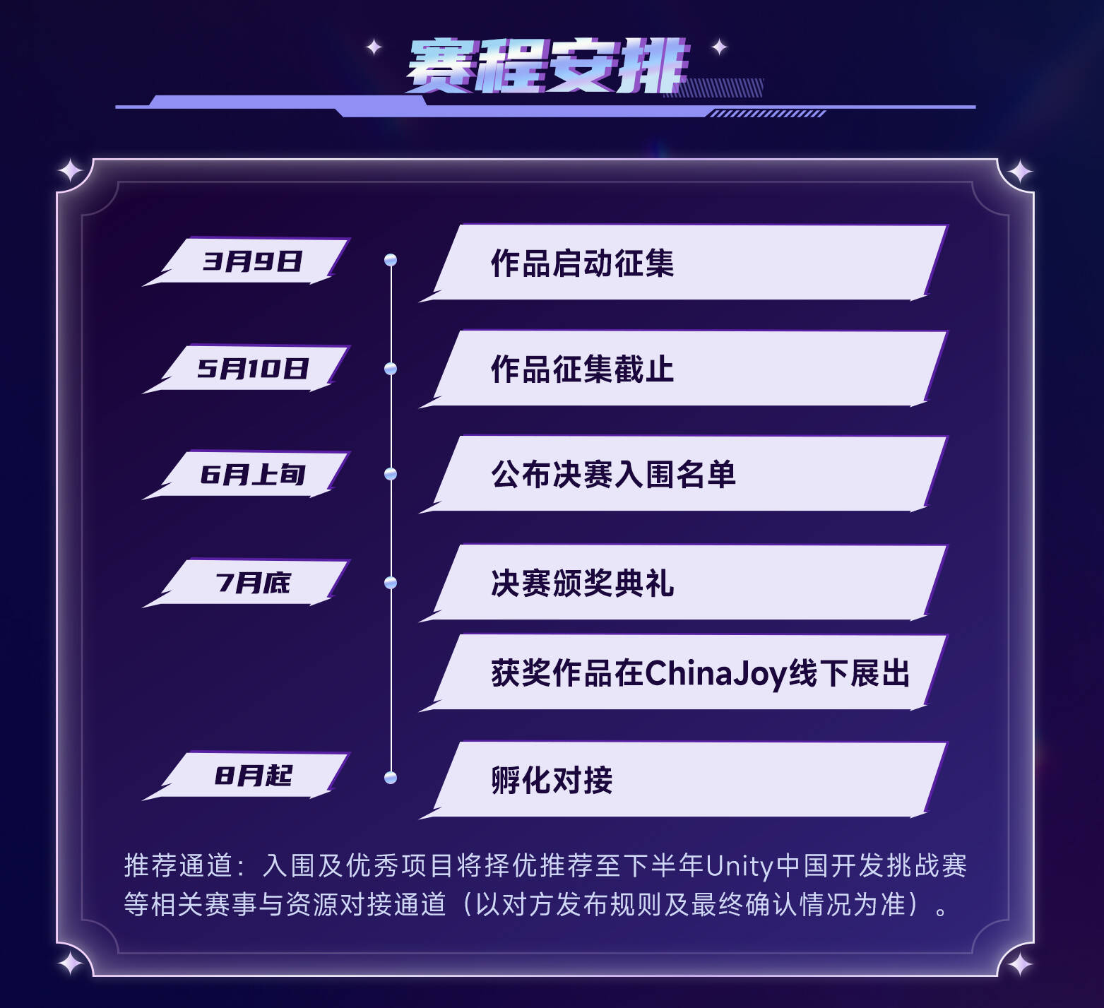 同时,组委会将对入围及优秀项目进行择优推荐,纳入下半年Unity中国开发挑战赛等相关赛事与资源对接通道(以Unity中国发布赛事规则及最终确认情况为准),为项目提供进一步展示交流与能力提升机会。