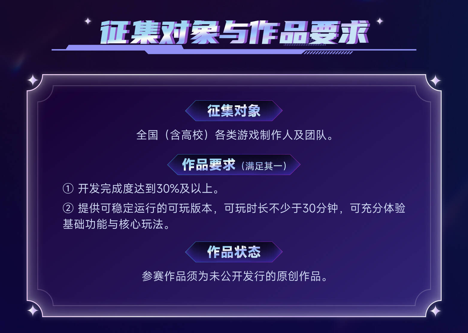 2. 完成度要求:参赛作品开发完成度需达到30%及以上,或提交可稳定运行的可玩版本(可玩时长不少于30分钟),能够充分体验游戏基础功能及核心玩法内容。