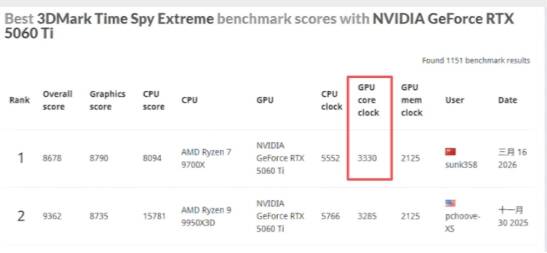 与此同时,技嘉在甜品级市场也有亮眼表现。技嘉RTX 5060 Ti 8G魔鹰显卡凭借卓越的超频潜力,在3DMark Time Spy Extreme基准测试中核心频率突破至3.33GHz,展现出强劲的超频能力。