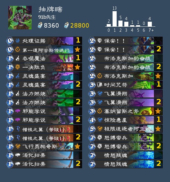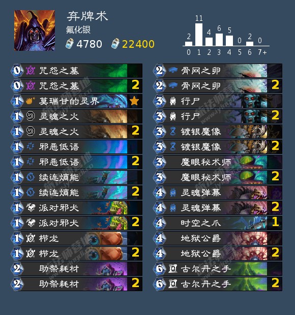 目前很多新兴卡组都有朝着这个方向进行发展的趋势,无论是弃牌术还是树人德,都是前期频率展开,中后期则使用巨大的破碎现实栽培或地狱公爵等实现压制,可以说,现在的狂野天梯是一个巨大的三条七贼。