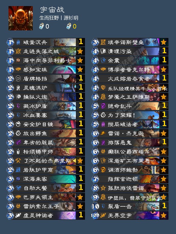 卡组构筑思路是完全放弃资源(或者说厚度),所有质量全部依靠任务,放弃大劣对局(猪术和光速牧),专心抓快攻和超展开。因为宇宙战带的针对牌越多强度越低,本身就不是有稳定制胜手段的卡组,所以尽量拿下优势对局,可以提高胜率。新卡指挥官嘉顿,能方便中期找牌和开任务奖励后找开门,或者基尔加丹后和对手打质量,同时也是被猪刀砍掉水晶后的唯一反抗手段。