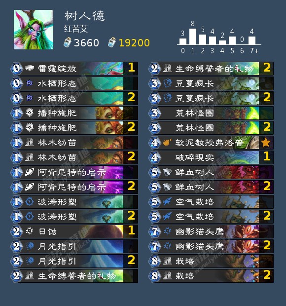 红苦艾亚服登顶的树人德,携带了启示启示礼物体系进行减费存费蓄爆。破碎现实如不携带可以换玉莲印记。新卡荒林怪圈被减费后合成会被视为减两次费用从而变为1费。