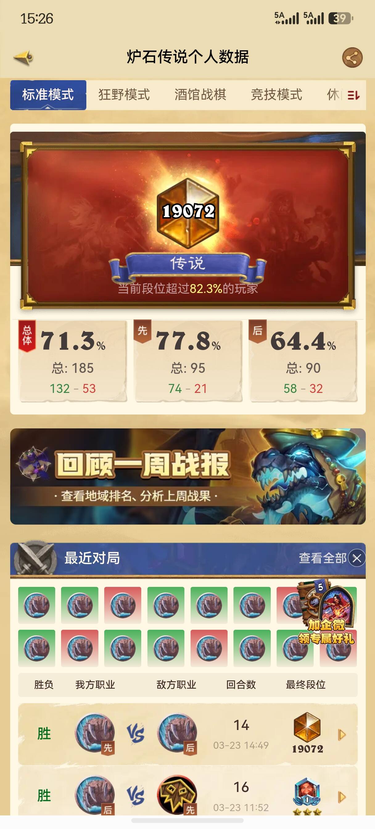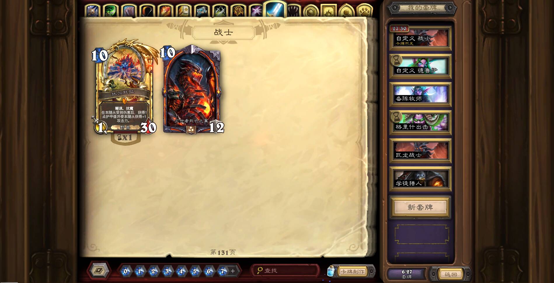 虽说新号送的一套牌就是灌注德,但由于我事先不了解,也没打算打天梯,领的是战士、牧师、猎人三套牌,组牌的时候发现缺了几张卡,只能算瘸腿的灌注德,秉着坚决不拆卡不合卡的原则,那就用其他卡代替,瘸腿加入,最终花了三天的时间以71.3%的胜率顺利上传。