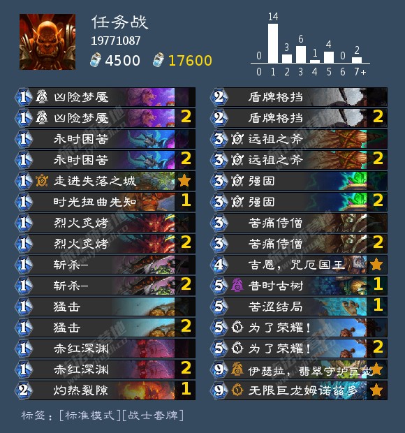 ### 任务战# 职业:战士# 模式:标准模式# 甲虫年## 2x (1) 凶险梦魇# 2x (1) 斩杀# 1x (1) 时光扭曲先知# 2x (1) 永时困苦# 2x (1) 烈火炙烤# 2x (1) 猛击# 2x (1) 赤红深渊# 1x (1) 走进失落之城# 1x (2) 灼热裂隙# 2x (2) 盾牌格挡# 2x (3) 强固# 2x (3) 苦痛侍僧# 2x (3) 远祖之斧# 1x (4) 吉恩,咒厄国王# 2x (5) 为了荣耀!# 1x (5) 昔时古树# 1x (5) 苦涩结局# 1x (9) 伊瑟拉,翡翠守护巨龙# 1x (9) 无限巨龙姆诺兹多# AAECAePjAwip9Qa2lAfUlwfKqwfWsgfYsgeVwgeExAcLn58EhqAEjtQEnNQE4+YGtI8Hy5gH1aYH/K8H0LIHnMIHAAA=# # 想要使用这副套牌,请先复制到剪贴板,然后在游戏中点击“新套牌”进行粘贴。头一回分享卡组,碰到的对手用的这一套,跟其他任务战最大的差别是时光扭曲先知+烈焰炙烤的combo,然后用所有的过牌尽快过空牌库坐等任务奖励
