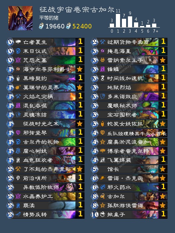 卡组赢点1是通过征战任务弃光对手手牌,但都于大部分偏后期对手,这都不够赢。赢点2是通过各种弃牌手段,达成无限古加尔雷诺的无限资源无限解场,甚至直接otk对手。各种思路如下:2牌无限铺场回血,古加尔+雷诺。3牌无限otk,古加尔+雷诺+地狱烈焰(或邪火药水),古加尔+波波+邪火药水。2牌启动转无限,古加尔+眼魔,可以手上任意卡牌进入弃牌池无限衍生,也可以让一张卡多次进入弃牌池衍生多张。前提是在血量见底前需要把雷诺送弃牌池并有血量打出。4牌无限otk,古加尔+雷诺+扭曲虚空+伤害。博学者的小comb:1.博学者上手,灵界把雷诺和邪火药水送进弃牌。2.后手4费博学者,5费硬币+芬利开任务,必定过道牌库底的0费消灭。3.打快攻博学者可以考虑直接拍,这样掀桌子,英雄雷诺,雷诺都会很快上手。