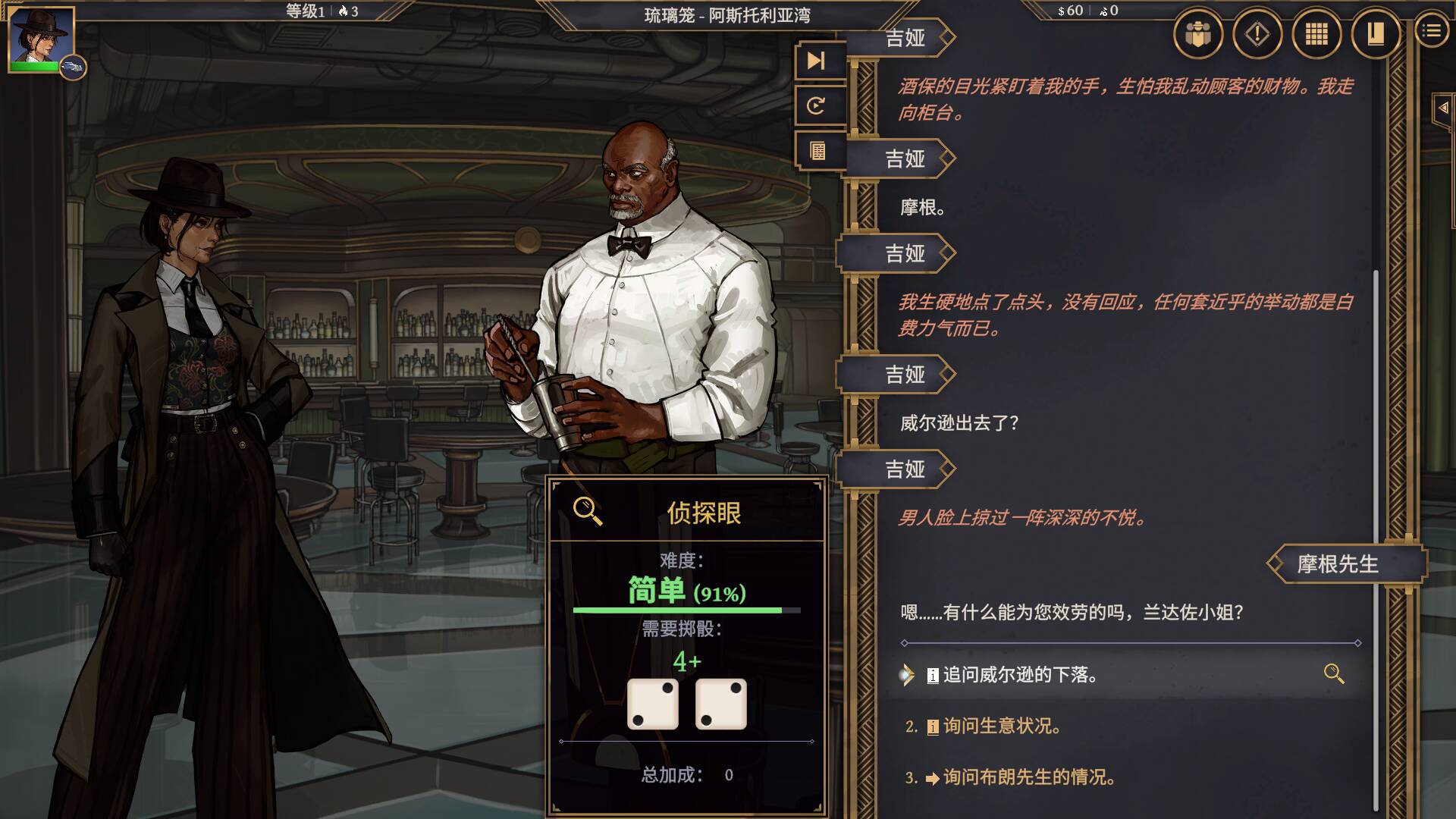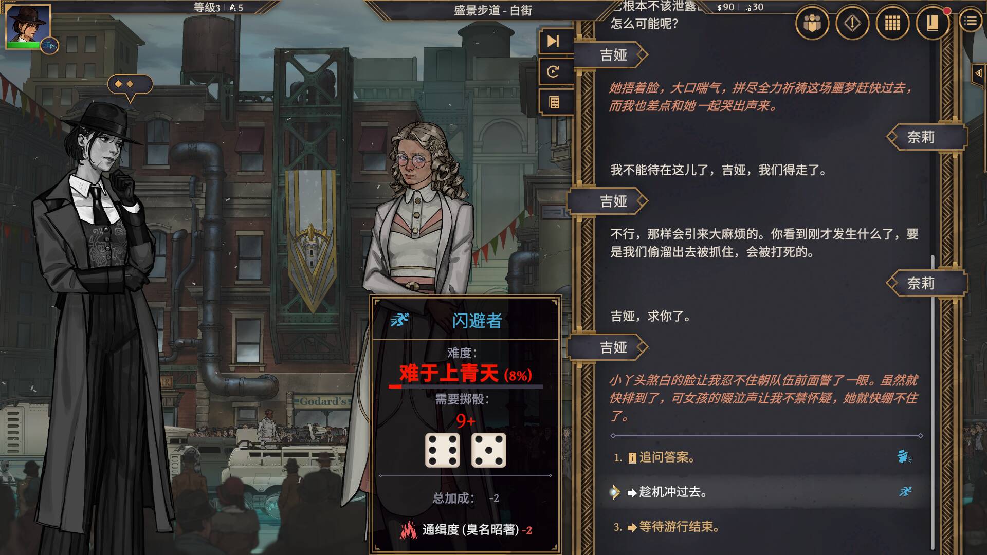 这些属性,会给你解锁更多的对话选项和行动方式。但就算你的属性再高,也不是万能的。游戏里的行动成功率,通过投骰子的点数来判定,不存在 100% 成功的情况。哪怕成功率超过90%,也依然有触发意外的可能;即便是小概率事件,也存在成功的机会。大部分失败,只会让你在当前场景的对话中陷入被动,或是直接触发战斗,都属于可承受的损失。