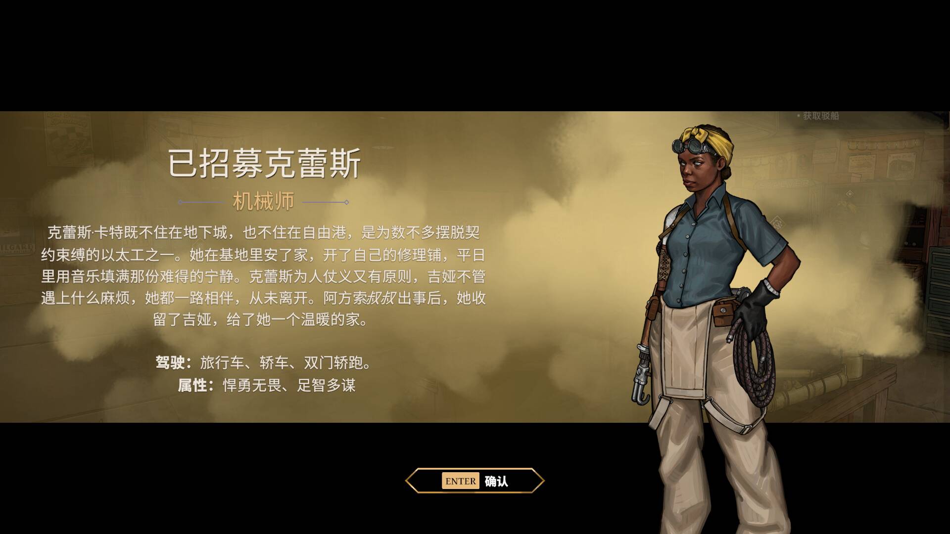 我第一个招募到的伙伴,是个叫克蕾斯的机械师。她既不住在地下城,也不住在自由港,是为数不多摆脱契约束缚的以太工之一。她在基地里安了家,开了自己的修理铺,平日里用音乐填满那份难得的宁静。克蕾斯为人仗义又有原则,不管我遇上什么麻烦,她都一路相伴,从未离开。在我走投无路的时候,是她收留了我,给了我一个能落脚的家。