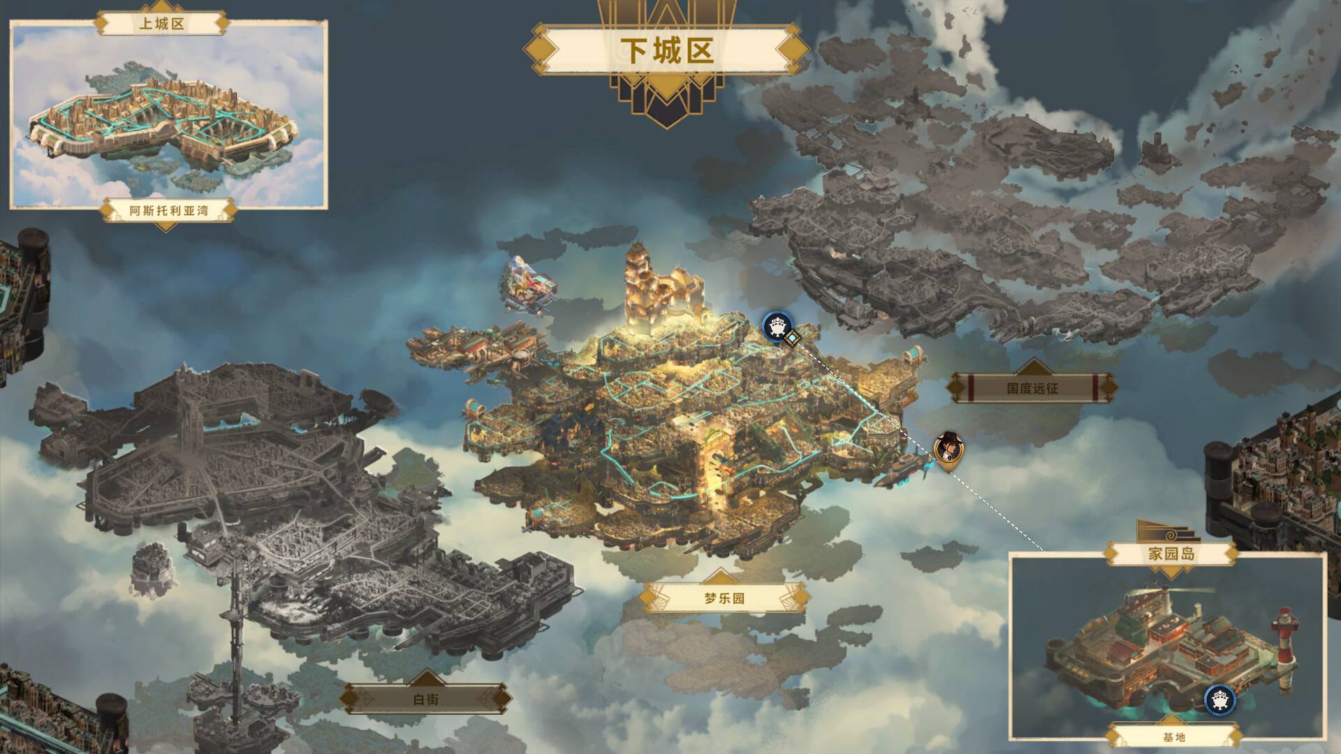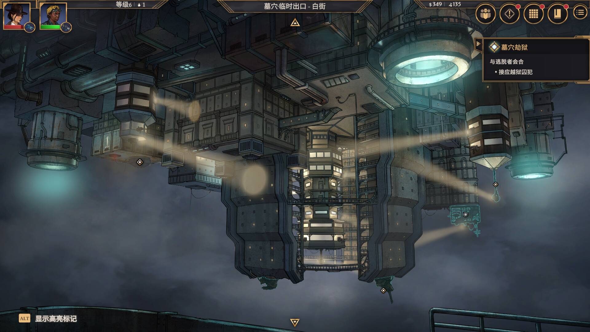 游戏的美术风格,也给我留下了很深的印象。它整体的质感,深受1930年代经典侦探漫画的影响,线条硬朗,光影对比强烈,带着一种暗黑又复古的气质。同时,它又把装饰艺术的华丽感,完美地融合了进去。云层之上的新纽约,是明亮的,华丽的,金色的阳光洒在金属和大理石的建筑上,到处都是流光溢彩的繁华。而云层之下的旧纽约,是昏暗的,潮湿的,霓虹灯的光在积水的路面上晃荡,到处都是破败的建筑和绝望的气息。这种强烈的视觉对比,将这座城市的割裂感拉到极致,让你一眼就能读懂这个世界的核心矛盾。