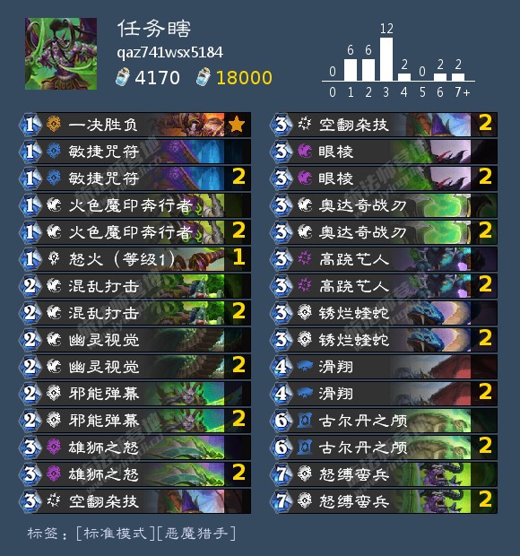 相比于任务术的简单无脑,这套任务瞎玩起来给自己一种“卧槽我好有操作”的满足感,前期思考该怎么样抽不会爆手牌,中期思考上刀之后怎么刷流放,后期思考怎么斩杀对面比较帅:牌打光,库抽光,场解光。许许多多瞎子的专属词条流放让我不禁感慨,这才是真瞎子,恶魔猎手正统在任务瞎。当时也是国服刚回归,炉石在国内热度最高最激情四射的时候。我在狂野用脏牧被打急了的时候就玩任务瞎,回忆起来我其实如此之强大。卡组玩的多才有羁绊,发牌员才知道你想要什么牌。想要游客起手就发给你,想要流放就给你夹在两个大哥中间,想要前期抽牌就在七八费把咒符发给你。玩的时候不禁感慨,其实不是我在打炉石,而是发牌员大人在玩弄我罢了。