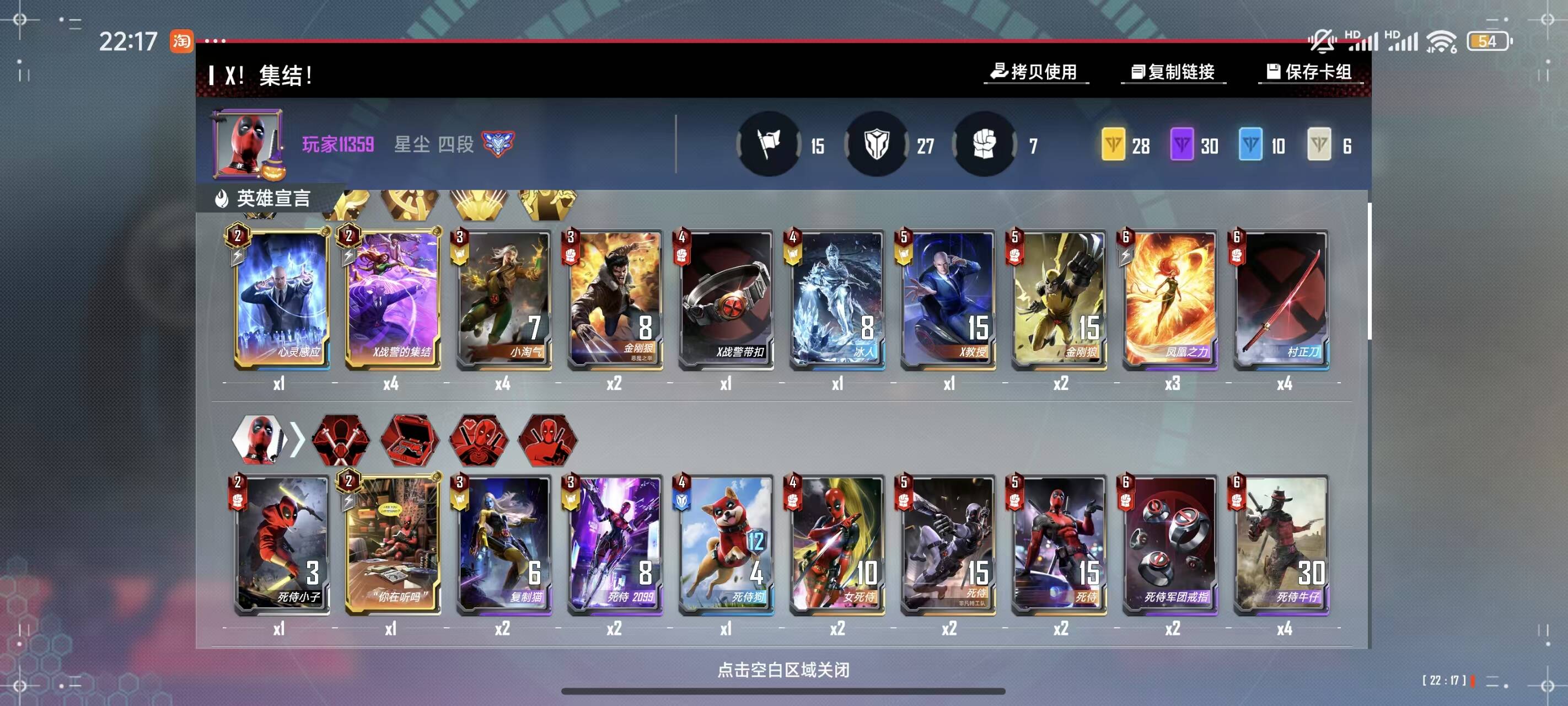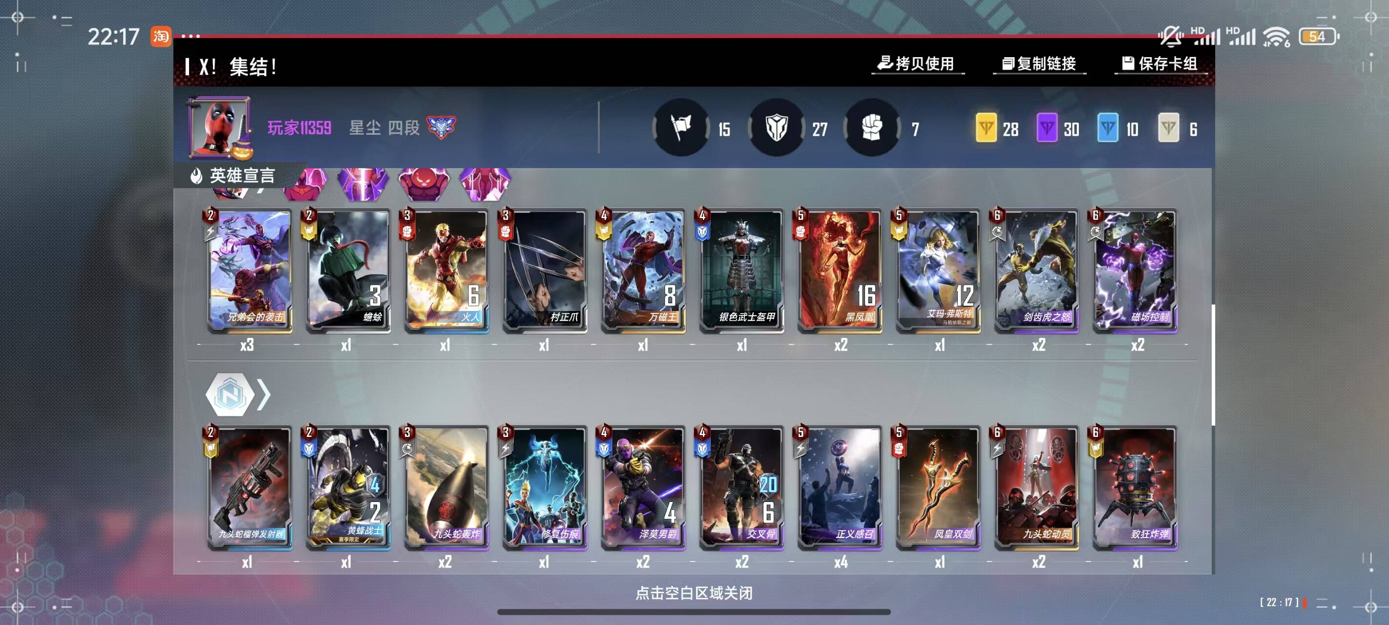 要找的牌大部分都在3本,1回合直接升本,2-3回合3本搜链接卡保血定阵,3回合死侍来得多直接九头蛇过渡转死侍,5回合没有幻影猫直接放弃转黑凤凰,5回合x终幕走黑凤凰,5回合万磁王终幕配合泽莫恰烂分,5回合万磁王终幕加x终幕相信发牌员 ,6费不带角色吃x终幕战力加成