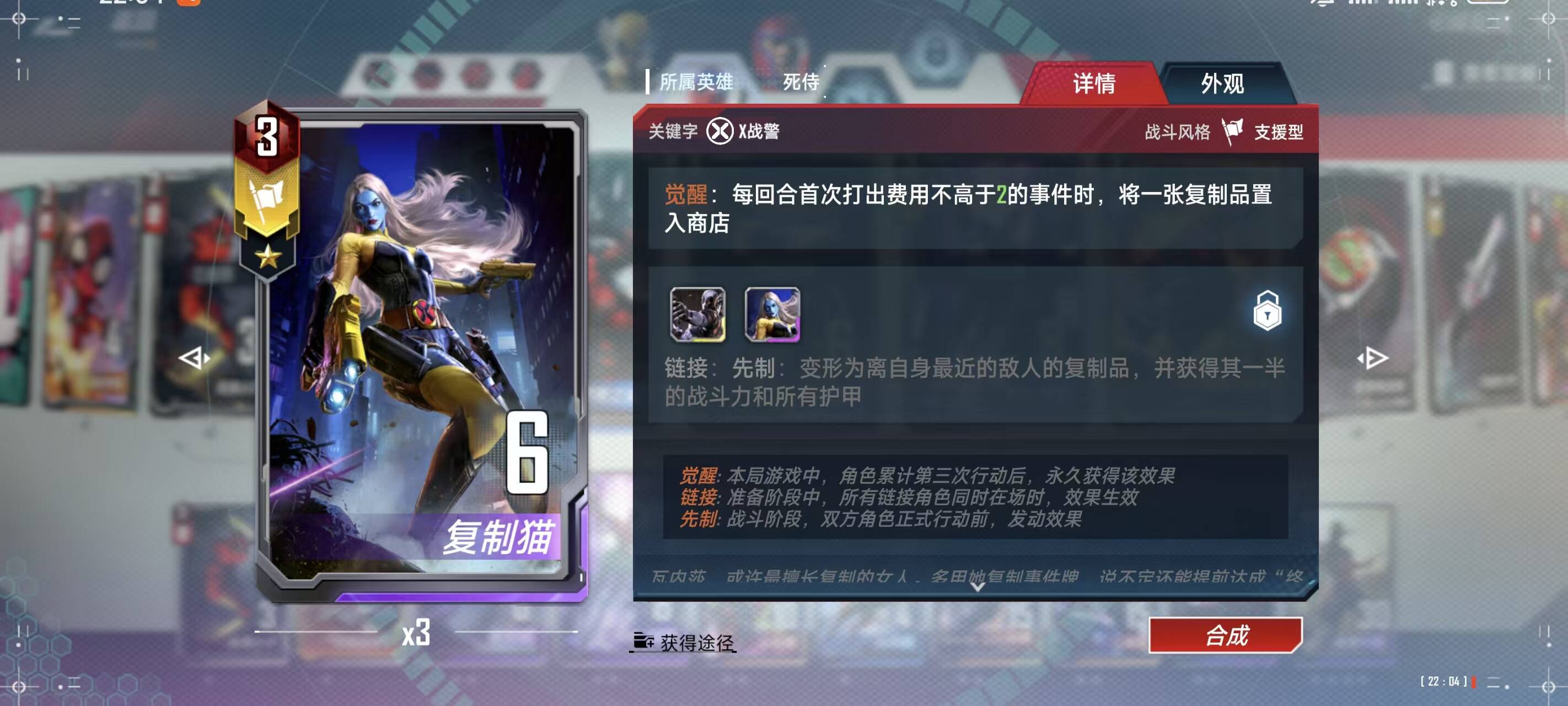 3费:2幻影猫,合成时可以加速启动买2张事件,更高的战力加成,防止兄弟会删卡,死侍2099,配合九头蛇,不用管他,战力会自己涨上去