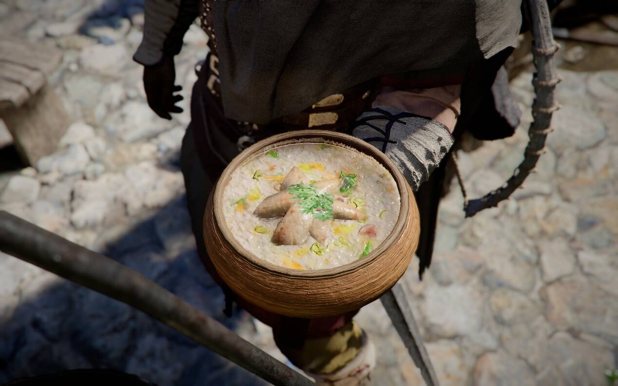 画面质感和场景细节是红色沙漠中即便是不上手都能感受到的绝对优点。在前作MMO背景下持续运行的宏大的世界观下,《红色沙漠》将故事性转化为了视觉上的优势。天气的变化,角色的构建,场景的交互反馈,甚至是作为战斗和解谜系统的片段的光影效果,都被发挥到了淋漓尽致。特别是当接受了“阿比斯”带来的科幻色彩和帕卫尔大陆的魔法要素之间的联系和冲突之后,游戏中作为“过度渲染”的粒子效果甚至有了故事层上的寓意和原理。不仅如此,《红色沙漠》还将画面的 冲击力硬生生塞进了游戏中的每一个角落,比如……一碗鱼肉粥?