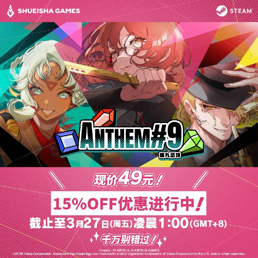 集英社游戏宣布,肉鸽宝石策略战斗游戏《第九圣诗(ANTHEM#9)》的音乐原声带将于3月20日(周五)起在Steam平台正式发售。在Apple Music, Spotify,等音乐流媒体平台也预计于4月3日(周五)起陆续上线。