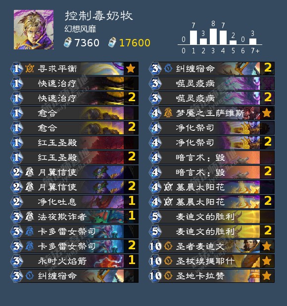 这套卡组在胜率上算是拯救成功了。打萨满大劣,打dk小劣,打灌注德均势。对阵其余卡组只要思路清晰,都能小优甚至稳吃。欢迎探讨构筑的调整空间。