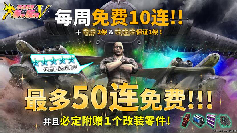 在「每周免费10连特殊抽选配给」中,★★以上MS保证可获得2架,★★★以上MS保证可获得1架,还能随机获得以下四种改装零件:「超限调整[框架] LV1」「重装甲 LV1」「新型耐实弹装甲 LV1」「复合框架[Type-A] LV1」的其中一项作为赠礼。