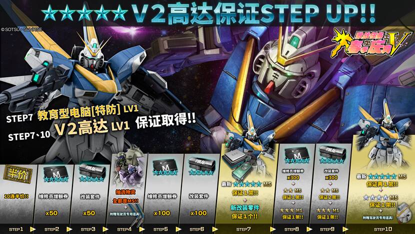 在 STEP7 可保证获得「V2高达 LV1」,并附赠新改装零件「教育型计算机[特防]」;在 STEP10 除了再保证获得一架「V2高达 LV1」,还可获得 1架 ★4 MS,请务必把握机会入手!