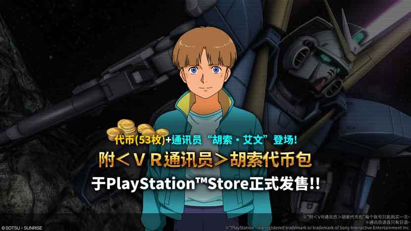 此外,活动期间内于 PlayStation™Store 也将贩卖内含 53 枚代币,并附赠<VR通讯员>的「附<VR通讯员>胡索代币包」。不妨把握这次机会入手,与新机体「V2高达」一起出击!