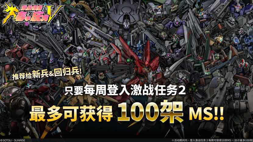 活动期间只要登入,每周再赠送20架机体,最多可获得100架 MS,请记得每天登入领取!