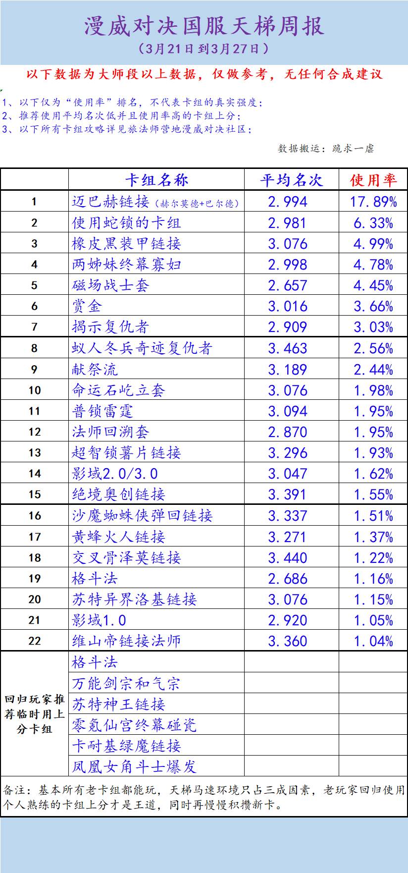 注:以下数据仅为“使用率”排名,不代表卡组的实际强度,例如薯片链接熟练以后可以稳定在90%甚至95%以上的胜率,血魔1.0/2.0/3.0熟练后都可以稳定在80%以上胜率,但是卡组难度较大,熟练使用的玩家并不多。