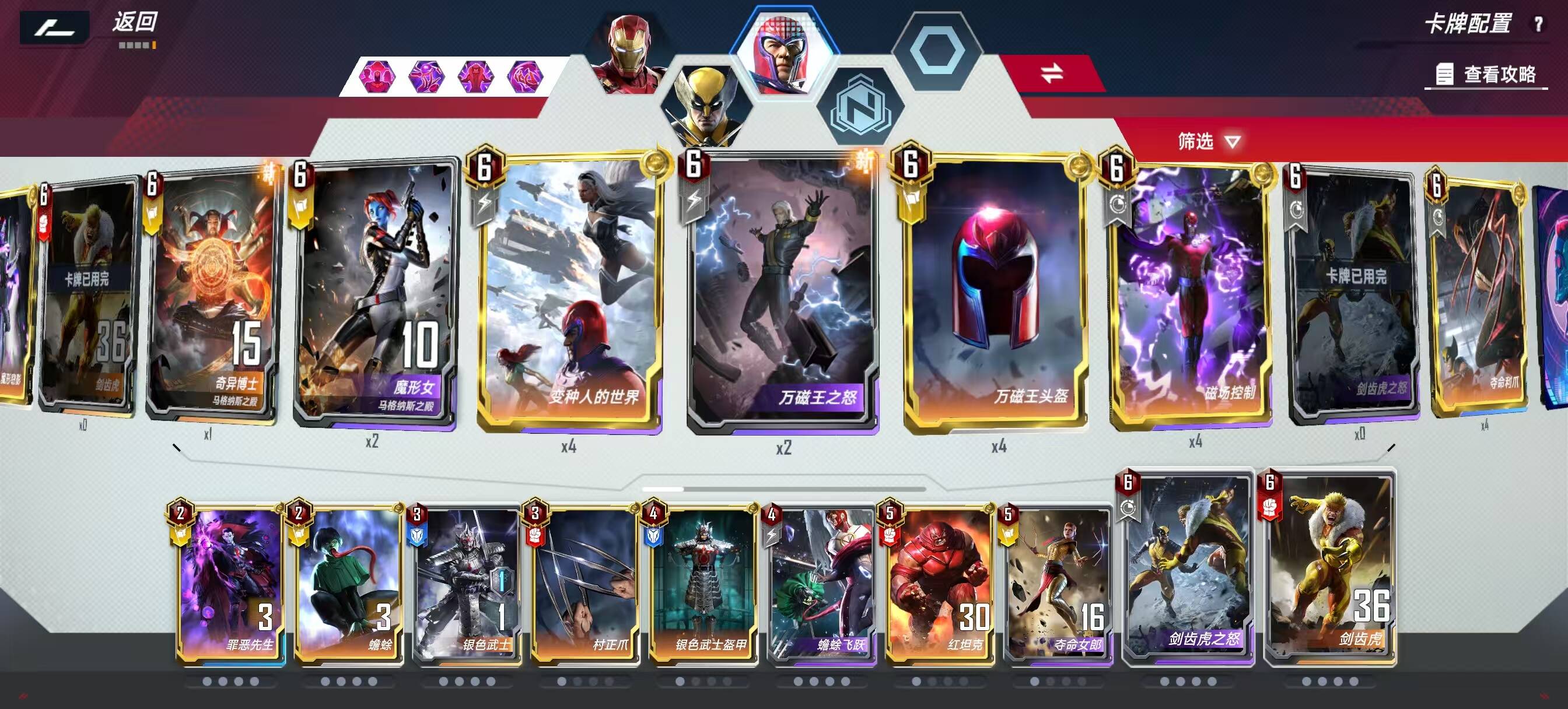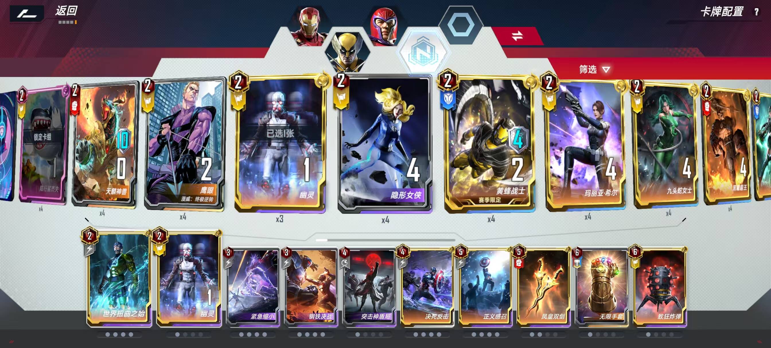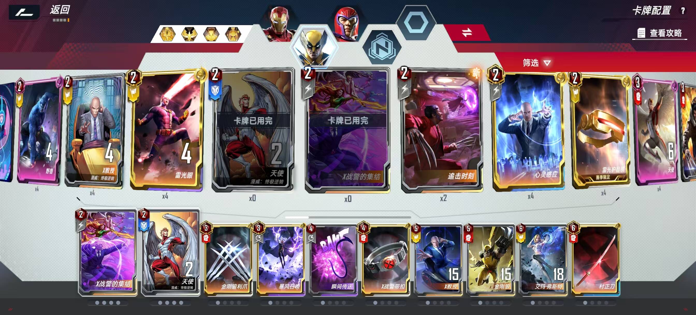 这套卡组成型入手非常简单,削弱了x终幕,但是没有削弱金刚狼两兄弟(金刚狼和剑齿虎是亲兄弟),整体来说前期能稳血,后期有战力,可以说是老少皆宜。