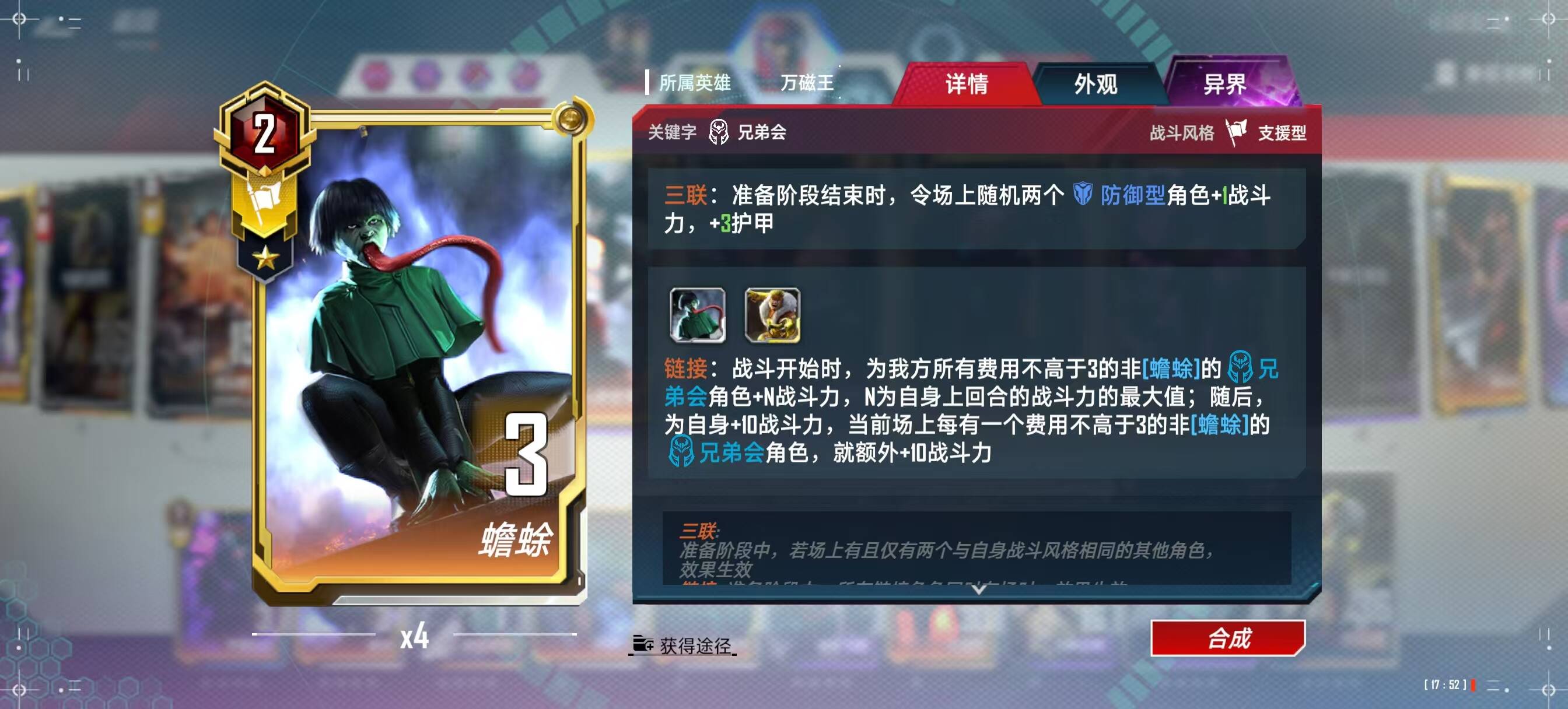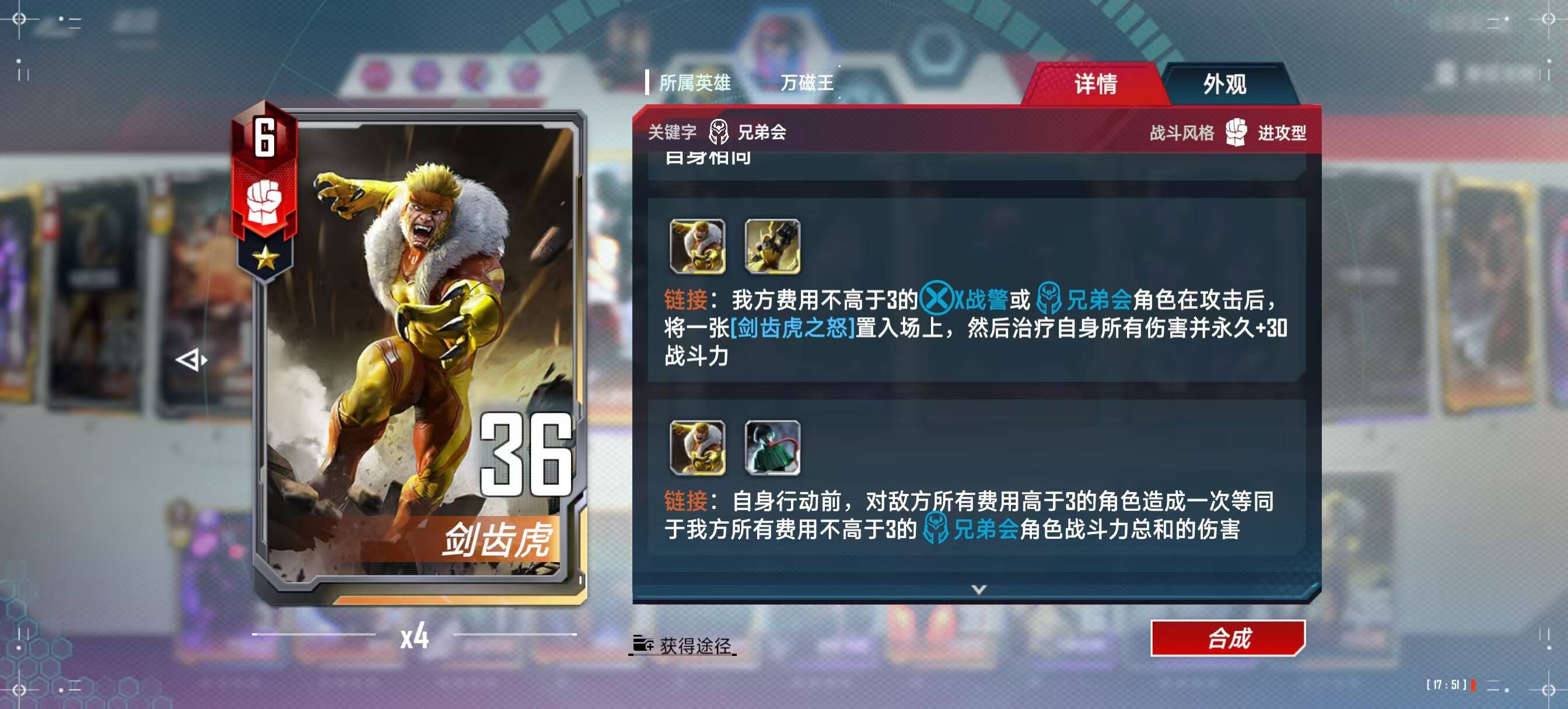 剑齿虎行动前对敌方所有3费以上单位造成我方兄弟会3费以下战力总和,而这恰恰非常契合x终幕和蟾蜍、银色武士,再看兄弟会的英雄选择: