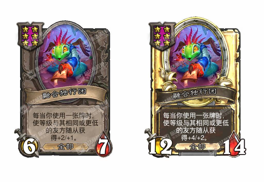 - 新:每当你使用一张牌时,使等级与其相同或更低的友方随从获得+2/+1。