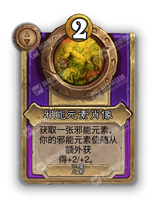 - 新:[2费] 获取一张邪能元素。你的邪能元素使随从额外获得+2/+2。