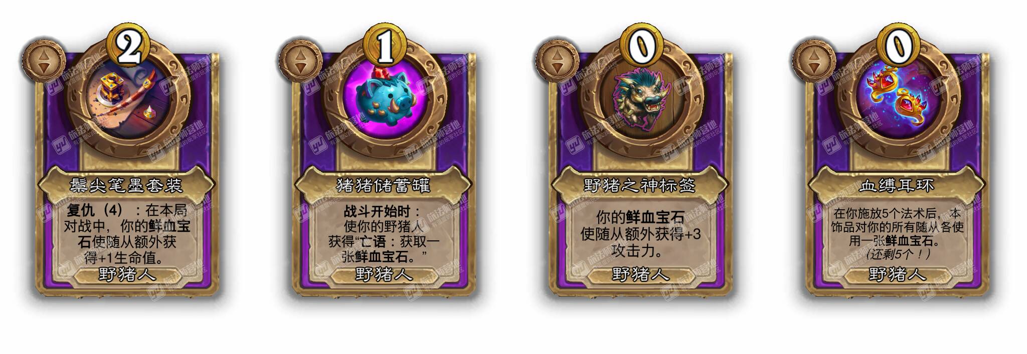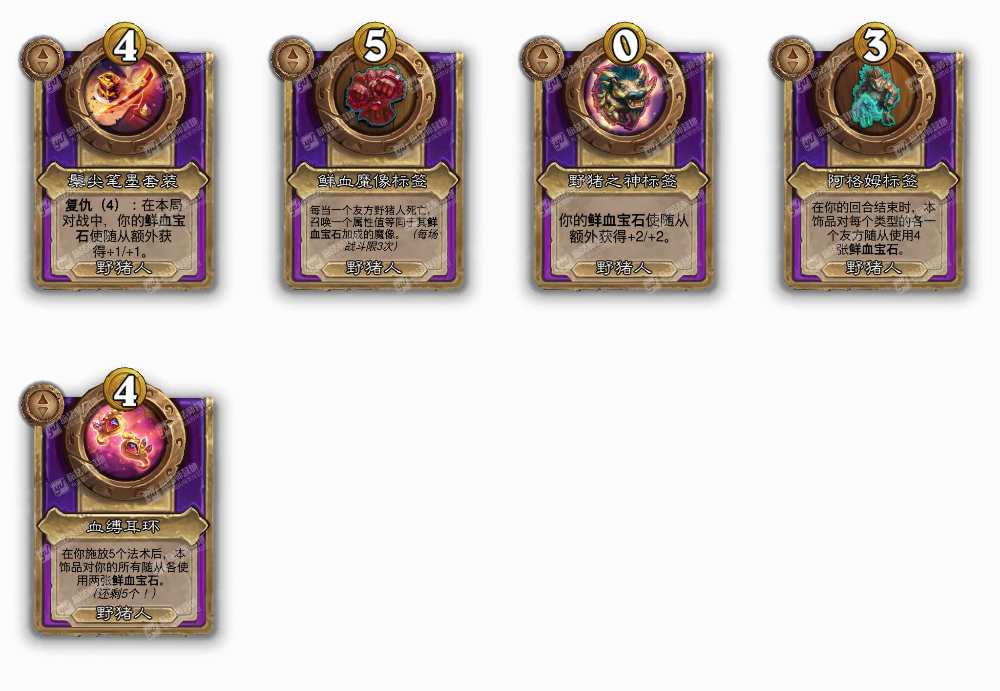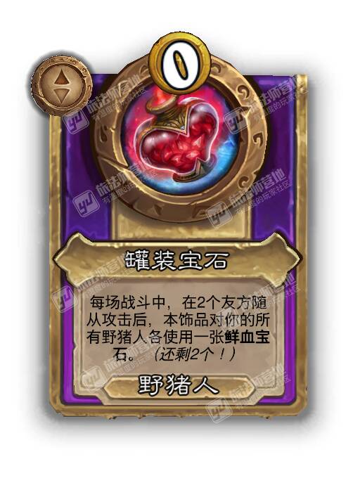 - [野猪人5费大型] 在你触发一个亡语后,本饰品随机对3个友方随从各使用一张永久的鲜血宝石。