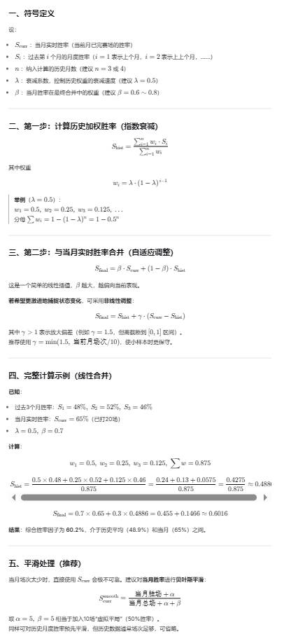 下面是试图建立一个比较原始的,基于过去数个月的每月胜率进行加权再与当月的实时胜率进行一次调整计算合并的“隐藏分数”计算方法。来自DeepSeek。